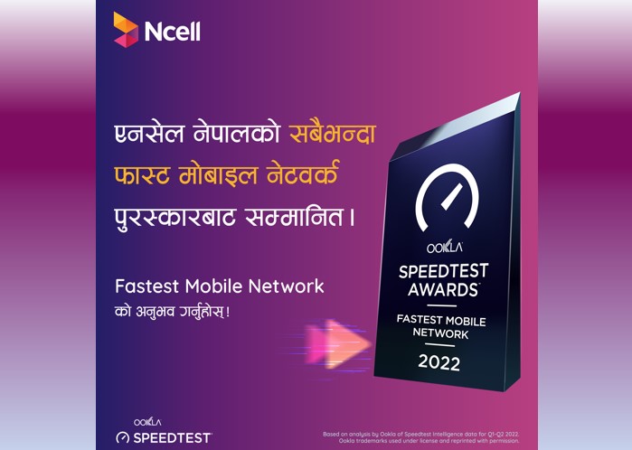 काठमाडौं : विश्वको अग्रणी मोबाइल र ब्रोडब्यान्ड नेटवर्क इन्टेलिजेन्स कम्पनी ऊक्लाबाट एनसेल आजियाटा लिमिटेडले जनवरी-जुन २०२२ को लागि नेपालको सबैभन्दा फास्ट मोबाइल नेटवर्क अवार्ड प्राप्त गरेको छ। एनसेलले आफ्नो मोबाइल डेटाको डाउनलोड र अपलोड गतिमा हासिल गरेको स्पीड स्कोरका आधारमा एनसेललाई यो सम्मान प्रदान गरिएको होे ।