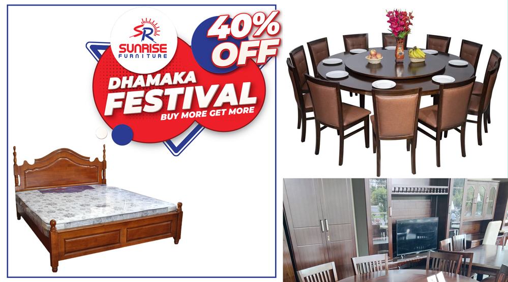काठमाडौं : नयाँ बानेश्वरस्थित सनराइज फर्निचरले दसैं तिहारलगायतका चाडपर्वलाई लक्षित गरी विशेष अफर ल्याएको छ । कम्पनीले अफर अन्तर्गत ग्राहकलाई ४० प्रतिशतसम्म छुट प्रदान गर्नेछ ।