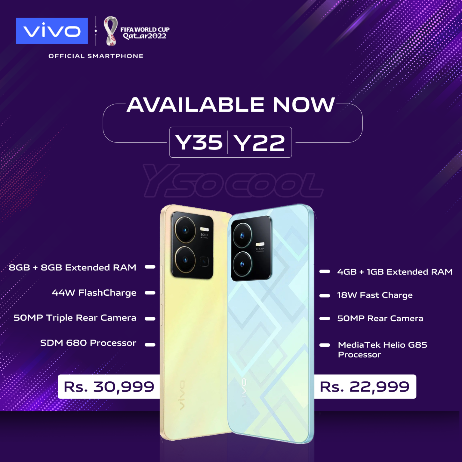 वाई३५ (८जीवी प्लस १२८जीवी) दुई ट्रेन्डी कलर भेरियन्ट – एगेट ब्ल्याक र डन गोल्ड कलरमा रु ३०,९९९ मा उपलब्ध छ । त्यस्तै ४जीवी र्याम र ६४जीवी रोम भएको वाई२२ स्टारलिट ब्लू र मेटाभर्स ग्रिन कलरमा रु २२,९९९ मा उपलब्ध छ ।