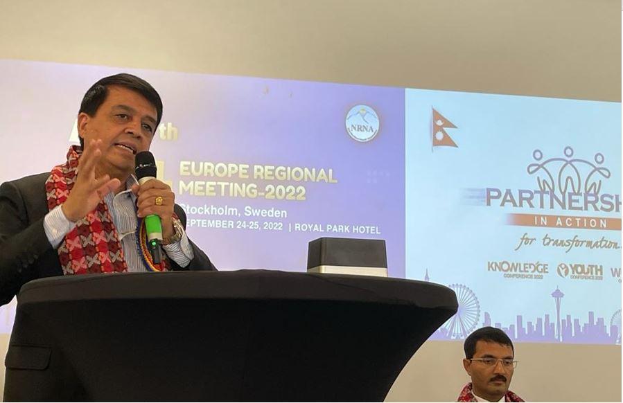 स्वीडेनमा आज आयोजित गैरआवासीय नेपाली संघ, एनआरएनको युरोप क्षेत्रीय १४औँ बैठकलाई सम्बोधन गर्दै उनले युरोपमा रहेका सबै नेपालीहरुलाई त्यहाँ आर्जन गरेको समृद्धि नेपाल भित्र्याउन तथा युरोपका उद्योगी व्यवसायीहरुलाई नेपालमा लगानीका लागि प्रेरित गर्न आग्रह गरेको एनआरएन युरोप समितिले जनाएको छ ।