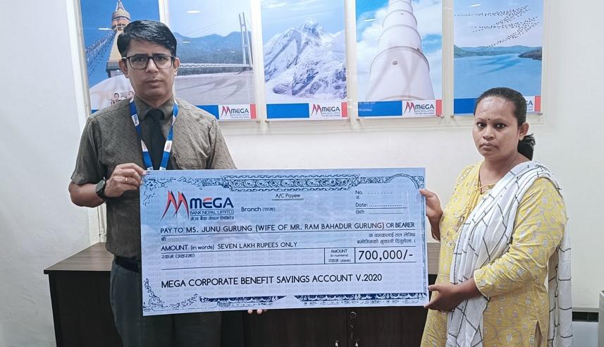 मेगा बैकमा ‘मेगा कर्पोरेट बेनीफिट सेभिङ्ग अकाउन्ट भि २०२०’ खोलेका नेपाली सेनाका राम बहादुर गुरुङका परिवारलाई बैंकले सोही खातामा भएको योजना बमोजिम बीमा बापत सात लाख रुपैयाँ हस्तान्तरण गरेको हो ।