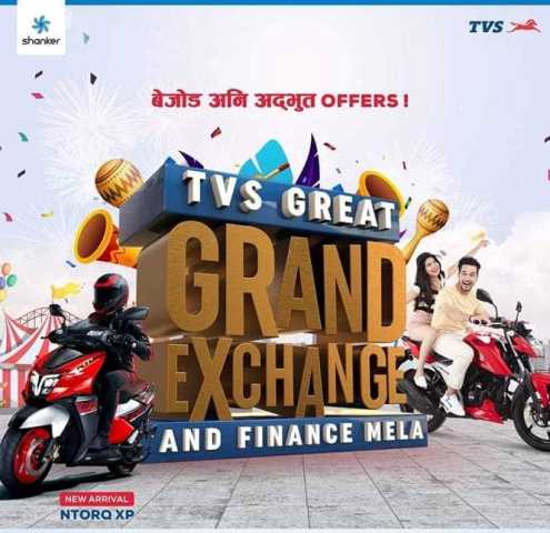 काठमाडौं : काठमाडौंको भृकुटीमण्डपमा टिभिएस ग्रेट ग्राण्ड एक्सचेन्ज एण्ड फाइनान्स मेला हुने भएको छ । मेला असोज ३१ गतेदेखि कार्तिक ५ गतेसम्म संचालन हुने बताइएको छ । मेलामा NTORQ XP स्कुटर पनि रहने छ ।