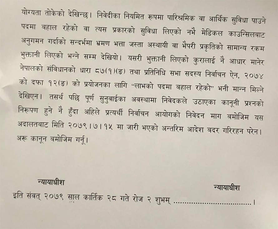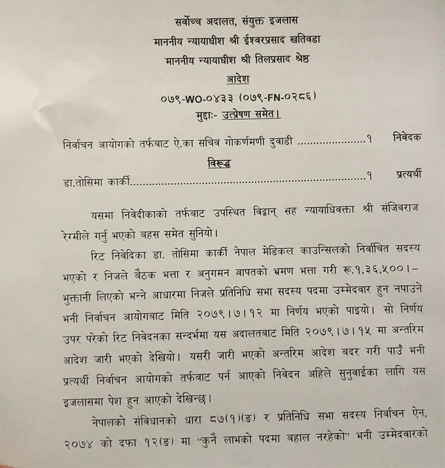 मेडिकल काउन्सिलको निर्वाचित सदस्य लाभको पद ठहर गर्दै निर्वाचन आयोगले कार्कीको उम्मेदवारी खारेज गरेकोमा सर्वोच्चका न्यायाधीश कुमार चुडालको एकल इजलासले अन्तरिम आदेशमार्फत यथावत् राखेको थियो ।