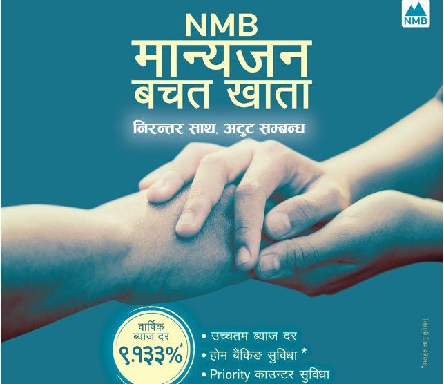 काठमाडौं : एनएमबि बैंकले एनएमबि मान्यजन बचत खातामा सबैभन्दा बढी ब्याज दिने घोषणा गरेको छ । सो खाता विशेषरूपमा ज्येष्ठ नागरिकहरूको आवश्यकताहरूलाई मध्यनजर गर्दै घोषणा गरिएको हो ।