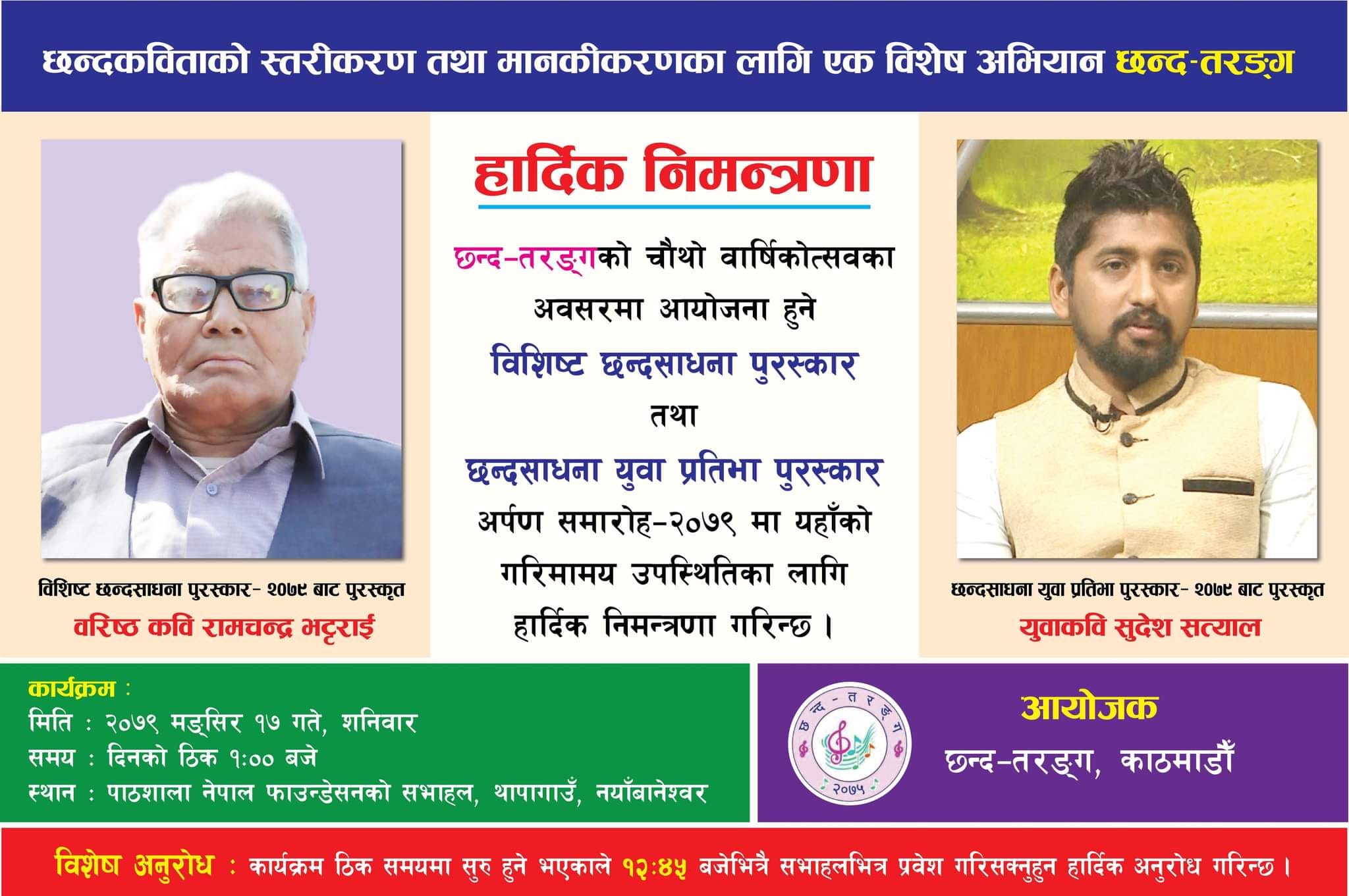 उक्त अवशरमा छन्द-तरङ्गले विशिष्ट छन्द साधना पुरस्कार बरिष्ट कवि रामचन्द्र भट्टराईलाई र छन्दसाधना युवा प्रतिभा पुरस्कार युवा कवि सुरेश सत्याललाई प्रदान गर्ने कार्यक्रम पनि रहेको छ ।