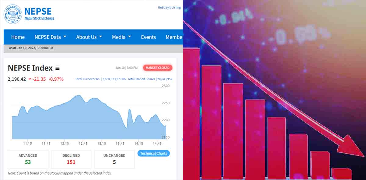 काठमाडौं, २६ पौष : साताको तेस्रो कारोबार दिन मंगलबार सेयर बजार घटेको छ । नेप्से परिसूचक २१।३५ अंकले ओरालो लागेर २१९०।४२ विन्दुमा पुगेको छ । लगातार उकालो लागेको सेयर बजार परिसूचक आज भने दोहोरो अंले घटेको छ। नेप्से आज २१ दशमलव ३४ अंकले घटेर दुई हजार एक सय ९० दशमलव ४३ विन्दुमा झरेको छ।