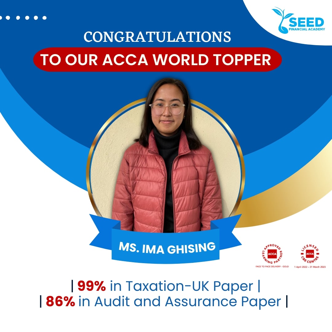Kathmandu : Ms. Ima Ghising, an ACCA student from Seed Financial Academy has achieved a remarkable feat by topping the world in two ACCA papers from the December 2022 exams. Ms. Ghising scored an impressive 99% in Taxation (TX) and 86% in Audit and Assurance (AA), outperforming thousands of other candidates from around the globe. She was ranked first globally out of 12,750 and 11,788 students, respectively, in AA and TX.