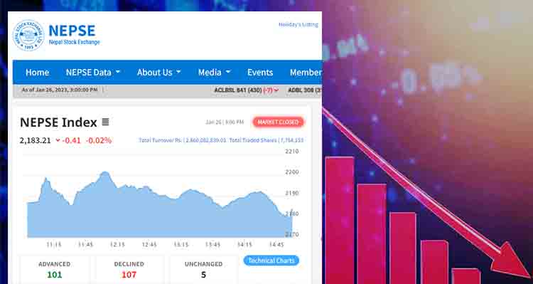 नेप्से परिसूचक ०.३५ अंकले घटेर २हजार१ सय ८३ दशमलव २१ विन्दुमा पुगेर बन्द भएको छ ।अघिल्लो दिन नेप्से सूचक १० दशमलव ३७ अंकले बढेर २ हजार १ सय ८३ दशमलव ६२ अंकमा पुगेको थियो ।