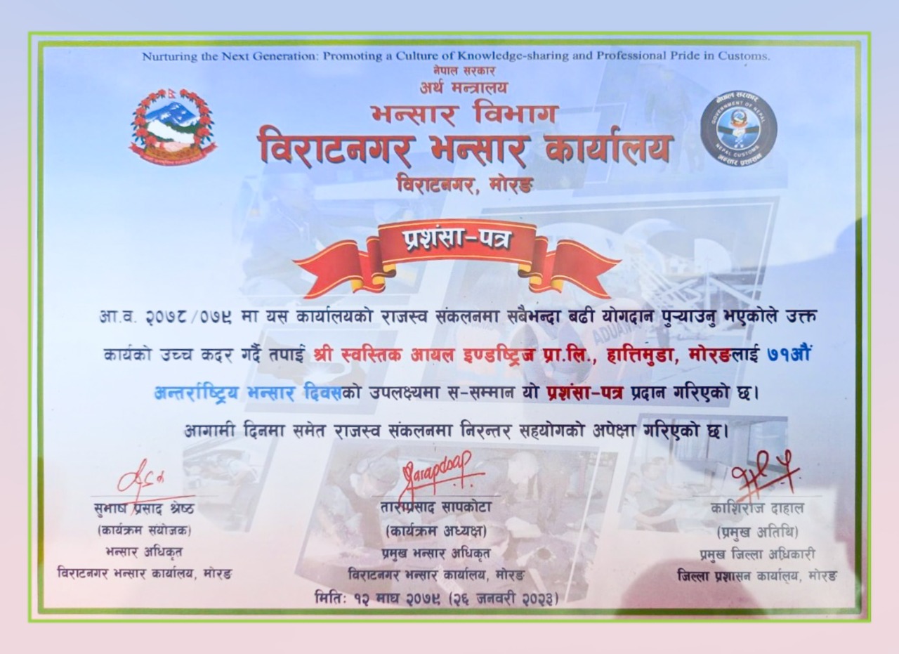 Kathmandu : The Biratnagar Customs Office has recognized Swastik Oil Industries P. Ltd, a subsidiary of the KL Dugar Group, for making the largest contribution to revenue collection. On the occasion of International Customs Day, a certificate of honor was issued in recognition of the fact that the company made the greatest contribution to the office’s revenue collection in the financial year 2078/079 BS.