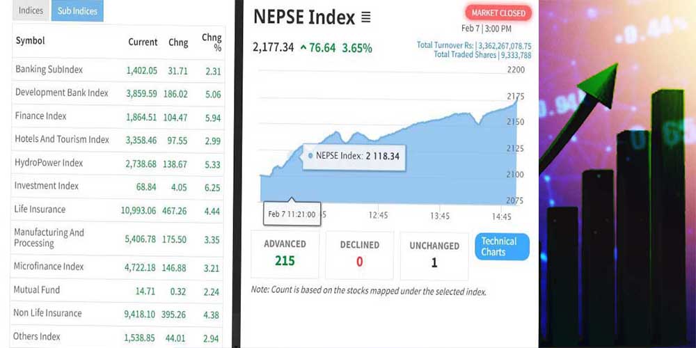 नेप्सेमा आज १३ वटा समुहहरुको कारोबार भएकोमा सबै समुहहरुको सूचक बढेर नेप्से पुरै हरियो भएको छ। यो मध्ये वाणिज्य बैंक समुहको सूचक ३२ दशमलव २४ अंकले बढेर १४ सय दुई दशमलव ५८ अंकमा चढेकोमा विकास बैंक समुहको सूचक पनि एक सय ८६ दशमलव २९ अंकले बढेर तीन हजार आठ सय ५९ दशमलव ८६ अंकमा चढेको छ।