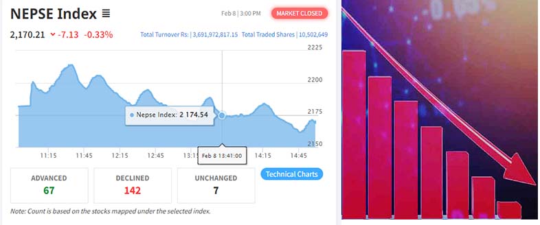 बुधबार बजार परिसूचक नेप्से ७ दशमलव १६ अंकले घटेर २ हजार १ सय ७०. १८ अंकमा बन्द भएको छ ।आज २५७ कम्पनीका १ करोड ५ लाख २ हजार ६४९ सेयर किनबेच हुदाँ ३ अर्ब ६९ करोड १९ लाख ७२ हजार ८१७ रुपैयाँको कारोबार भएको छ ।