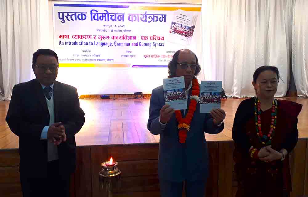 पोखरा : शिक्षासेवी रत्नमान गुरुङले नेपाली, अङ्ग्रेजी र गुरुङ भाषासम्बन्धी पुस्तक बजारमा ल्याएका छन् । गुरुङको पहिलो कृति ‘भाषा, व्याकरण र गुरुङ वाक्यविज्ञानः एक परिचय’ नामक कृतिको शनिबार पोखरामा आयोजित एक कार्यक्रममा साहित्यकार सरुभक्तले लोकार्पण गरे ।