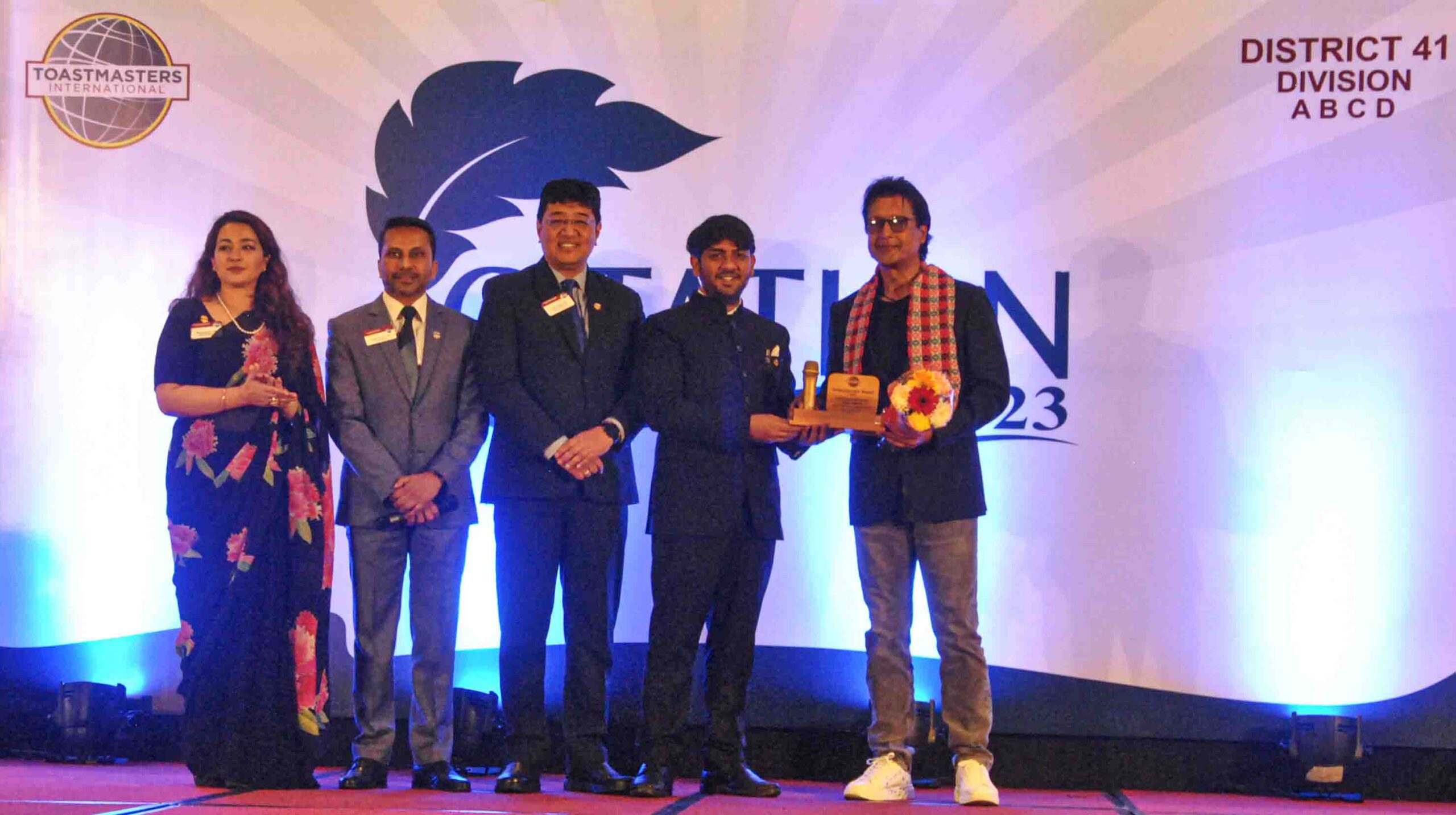 The prestigious Communicator Award, awarded to a non-toastmaster with excellence in communication was handed over to Mega Star Rajesh Hamal by 3 top leaders of Ankur Yadav DTM, District Director of District 41, Suman Shakya DTM, Program Quality Director of District 41 and Moon Pradhan DTM, club growth Director for District 41. Ranjit Acharya DTM, Immediate Past District Director of District 41 announced the winner of this year’s award.