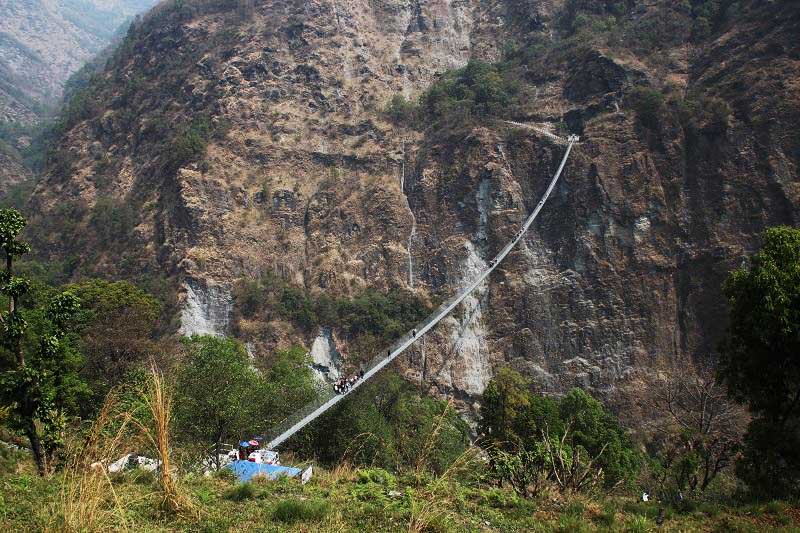 म्याग्दीको रघुगंगा गाउँपालिका–१ बेग र बाँदुक गाउँलाई जोड्नको लागि बेगखोलामाथि निर्माण गरिएको ३ सय ६५ मिटर लामो झोलुङ्गे पुल । दुई गाउँलाई जोड्न अग्ला पहाडमा निर्माण गरिएको झोलुङ्गे पुलले करिब ३ घण्टाको यात्रा ३० मिनेटमा छोटिएको छ । तस्बिर ः कमल खत्री/रासस