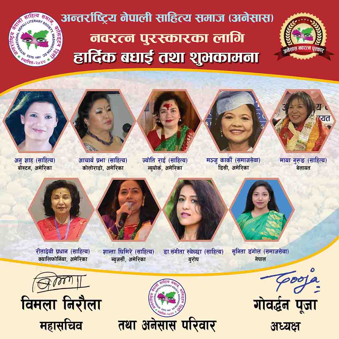 समाचारदाता / अन्तर्राष्ट्रिय नेपाली साहित्य समाजले नौजना महिलालाई नवरत्न पुरस्कारले सम्मान गर्ने भएको छ । नेपाली साहित्य, कला, संस्कृति र समाज सेवाका क्षेत्रमा संलग्न उनीहरूलाई नगद २ सय पचास डलरसहित सम्मान-पत्रले सम्मानित गर्न लागेको हो । नवरत्न पुरस्कार समिति संयोजक तारा अधिकारीको संयोजकत्वमा पुनम काफ्ले र गोमा न्यौपानेसंलग्न समितिको हालै बसेको बैठकले उक्त निर्णय गरेको हो ।