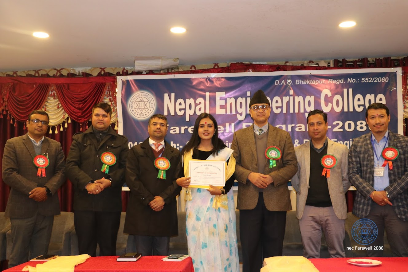 विदाई कार्यक्रममा संगीता रानाभाटलाई सिभिल एण्ड रुरल इन्जिनियरिङ, वाटर एण्ड स्टक्चर अवार्ड दिइएको थियो । भने, उनले नितिन कर्णसँग संयुक्त रुपमा सिभिल साइन्स अवार्ड पनि प्राप्त गरिन् । त्यस्तै, अञ्जली पाण्डेलाई चेयरमेन प्राइड गोल्ड अवार्ड, आस्था ढुंङ्गानालाई सिभिल प्रोगाम टपर अवार्ड, सुस्मी श्रेष्ठलाई सिभिल साइन्स अवार्ड तथा अजय कुमार यादवले जियो–टेक अवार्ड प्राप्त गरेका थिए ।