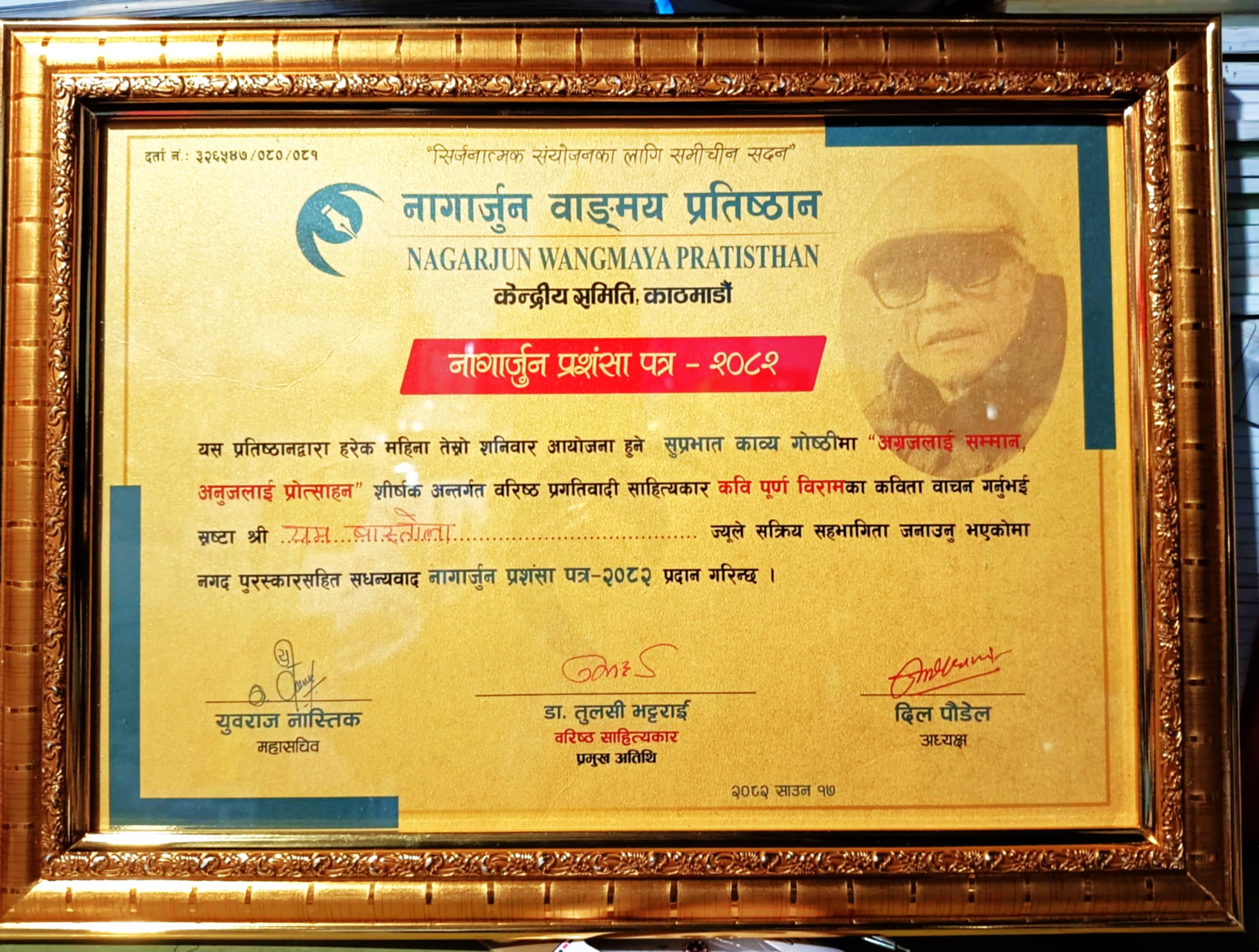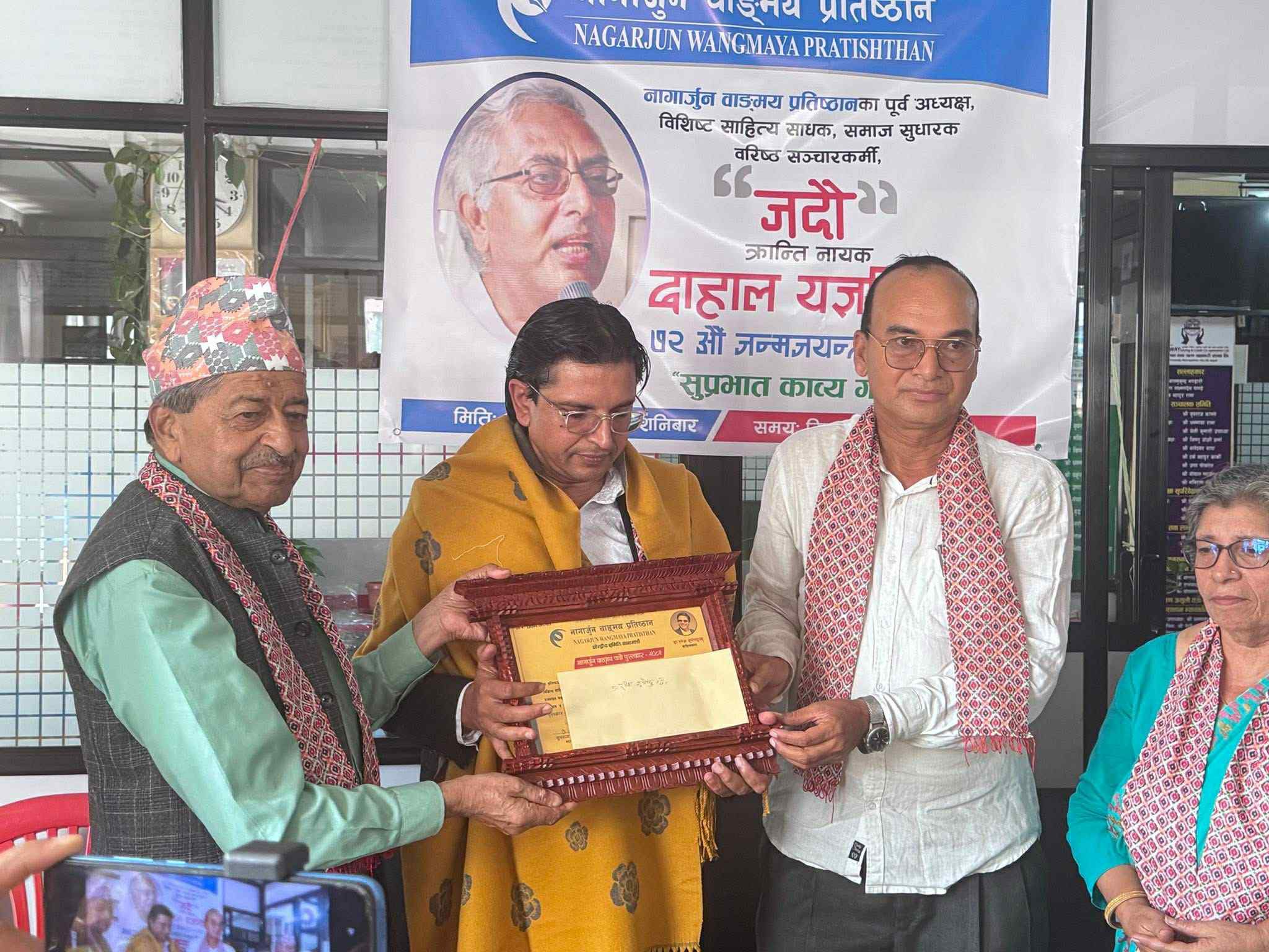 सुप्रभात काव्य गोष्ठी नागार्जुन वाङ्मय प्रतिष्ठानका अध्यक्ष दिल पौडेलको अध्यक्षता र साहित्यकार, प्राज्ञ डा. तुलसी भट्टराईको प्रमुख आतिथ्यमा सम्पन्न भएको हो । साहित्यकार डा. रमेश शुभेच्छुले दाहालका कृतिको खोज गरी उहाँको जीवनी व्यक्तित्व र कृतित्वलाई बाहिर ल्याउन खेलेको भूमिका उल्लेख्य रहकाले उहाँलाई पुरस्कृत प्रतिभाका रुपमा छनोट गरिएको छनोट समितिका संयोजक मातृका पोखरेलले बताउनुभयो ।