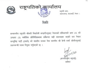 आज दिउँसो २ बजे ओलीलाई पद तथा गोनीयताको शपथ गराउने कार्यक्रम रहेको राष्ट्रपतिको कार्यालयले जनाएको छ ।